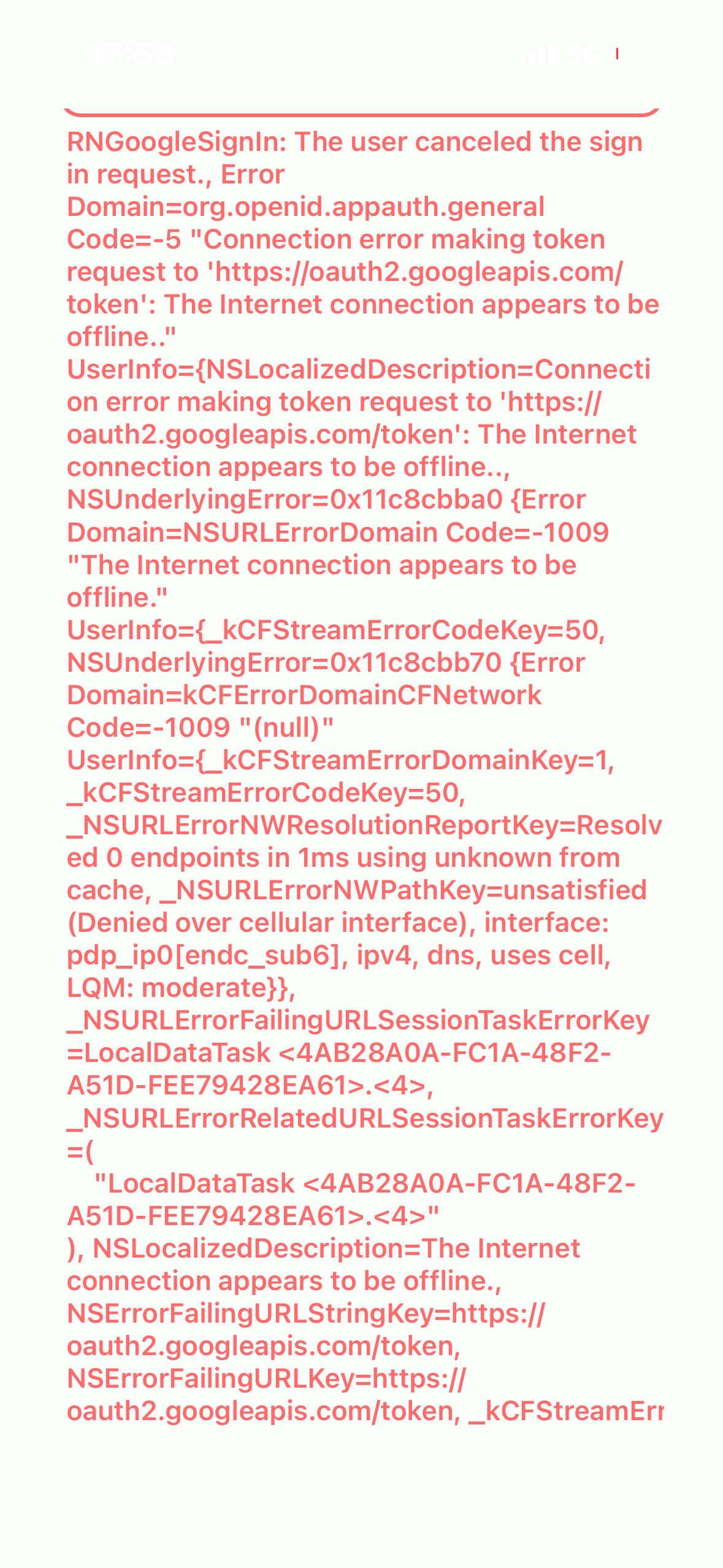 Lors de notre enquête, nous n’avons pas pu trouver d’erreurs liées à votre compte dans nos systèmes de débogage. D’après les journaux visibles sur la capture d’écran que vous avez partagée, il semble que le SDK Google Sign-In n’ait pas réussi à actualiser la session active à l’ouverture de l’application en raison d’un certain type d’erreur réseau. J’ai 2 théories possibles :
