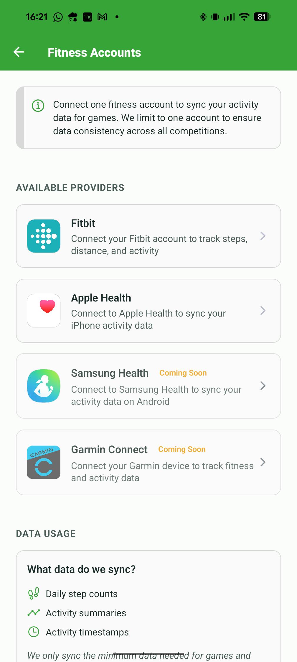 Une fois connecté (via Settings → Fitness Accounts → Garmin Connect), Garmin Connect enverra périodiquement vos dernières données à StepSmash pour vous tenir à jour dans vos jeux préférés.